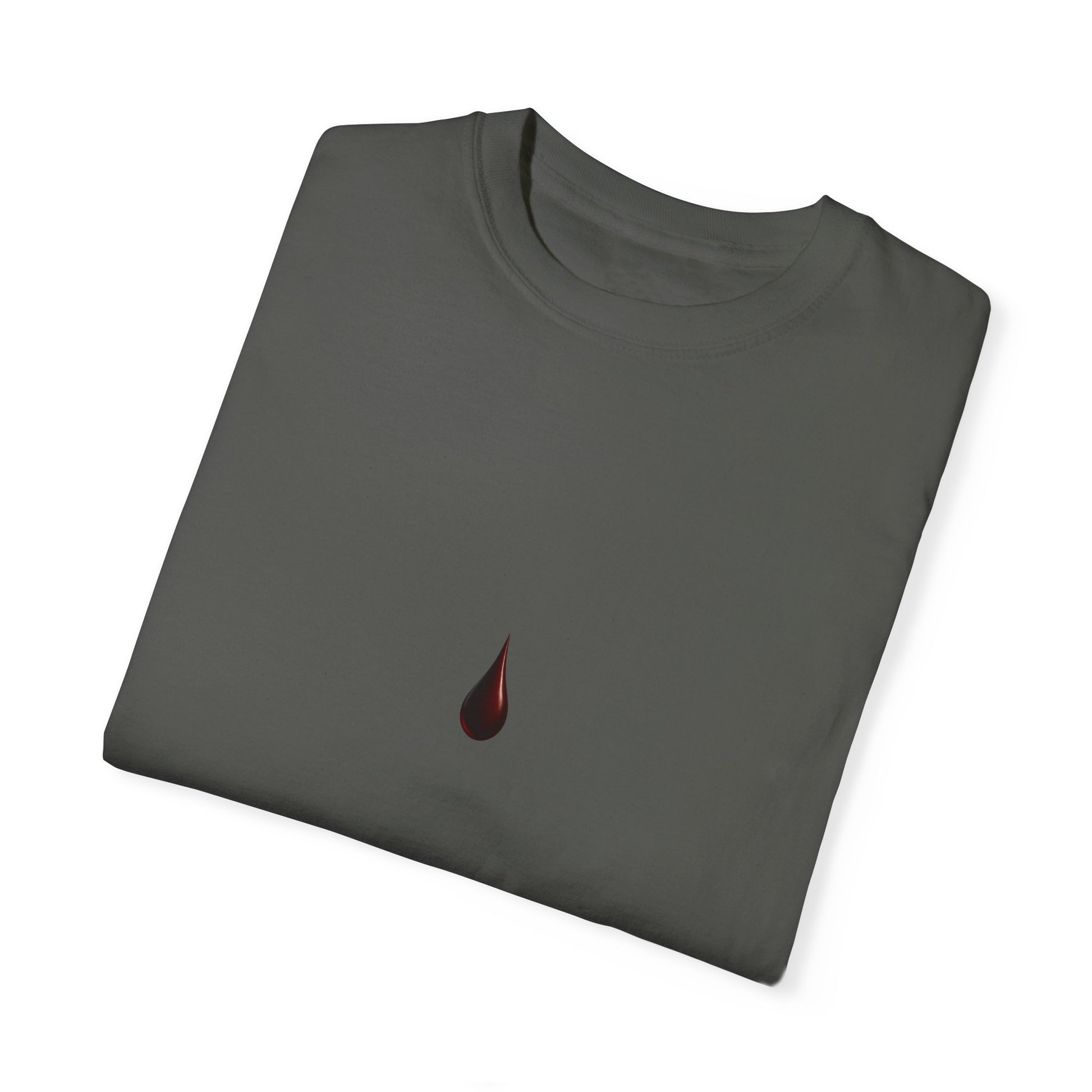 - Black & crimson blood drop graphic at center chest