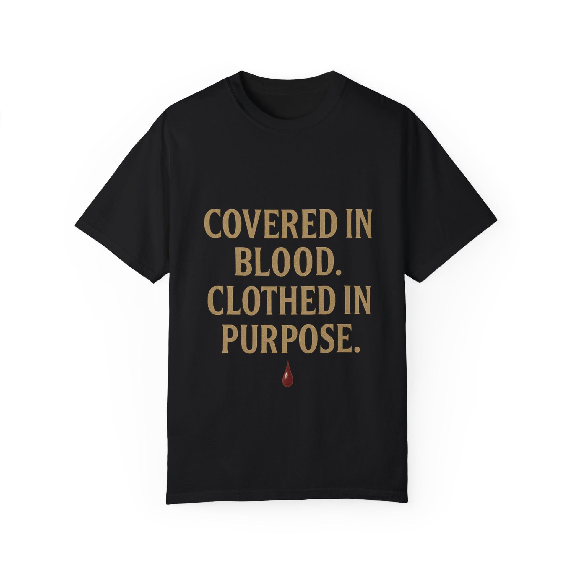 The “Covered in Blood. Clothed in Purpose.” Tee is a powerful declaration of identity — washed in the blood of Jesus and wrapped in destiny. With a gold-on-navy design and a single drop of blood beneath the message, this piece speaks life, purpose, and the ultimate covering.